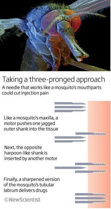 ဒါေပမဲ့ ယခုအခါမွာေတာ့ ဂ်ပန္ႏုိင္ငံ Kansai တကၠသုိလ္မွ ပေရာ္ဖက္ဆာ Seiji Aoyagi နဲ႔ အဖြဲ႕ဟာ ျခင္ေတြရဲ႕ ေသြးစုပ္အဂၤါဒီဇုိင္းကုိ ဆည္းပူးၿပီး နာက်င္မူကင္းေစတဲ့ ေဆးထုိးအပ္ေတြ တီထြင္ႏုိင္ခဲ့ၿပီျဖစ္ပါတယ္ ။ စမ္းသပ္ခ်က္အရ သာမာန္ေဆးထုိးအပ္ေတြထက္ ေဆးထုိးခ်ိန္ပုိၾကာေပမဲ့ တကယ္ကုိ နာက်င္မူ ေလွ်ာ့ပါးေစပါတယ္ ။